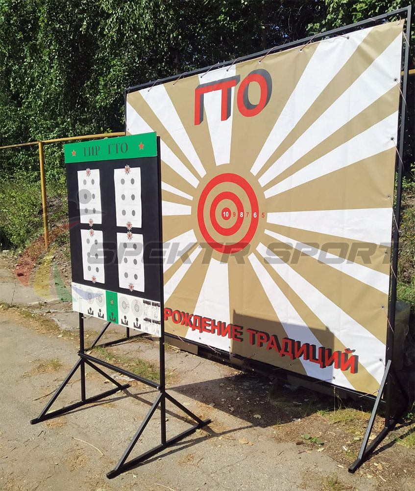 Пулеуловитель «Пулестоп». (размер: 250 х 210 см) Позади стенда на специальную раму подвешивается пулеуловитель – «Пулестоп», останавливающий пули, выпущенные мимо стенда. Пулестоп выполнен из специального особо прочного материала, благодаря чему в полотне не образуется дыр от пуль. Срок его эксплуатации неограничен в отличие от обычного брезента, используемого на рынке. Рекомендованная дульная энергия пневматического оружия - до 3 Дж. После занятия, пулестоп можно сдвинуть к стене или разобрать. Время сборки/разборки - 2 минуты.